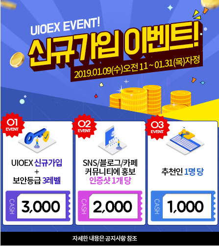 - 방법 : 이벤트 1. UIOEX 신규 가입하고 보안 등급 레벨 3까지 완료하면 3,000캐쉬 지급