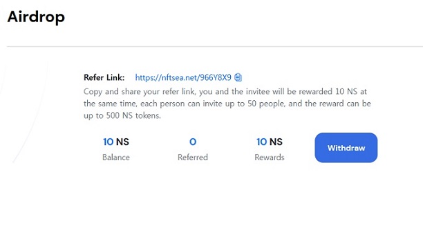 링크로 가서 자신의 이더리움 지갑주소 입력후 10NS받고 자신의 초대링크 받기