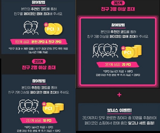 1단계 추천 1명 이상 = 2PCI (리워드 가입만해도 친구도 나도 2PCI 씩)